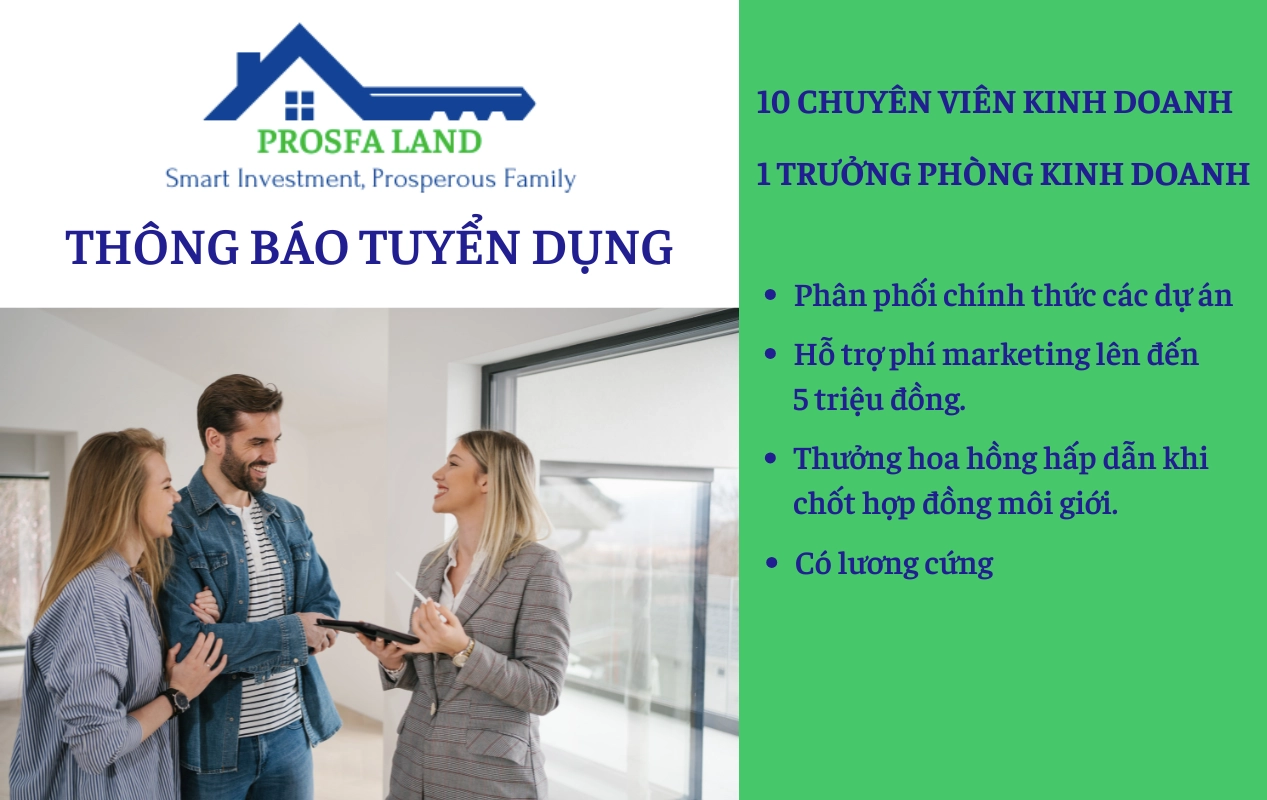 Công Ty TNHH Bất Động Sản Prosfa Land thành lập năm 2017, đến nay dịch vụ môi giới bất động sản Prosfa Land đã khẳng định được uy tín và năng lực cạnh tranh tốt trong ngành tư vấn, phân phối bất động sản, là đơn vị phân phối lớn của một số dự án nổi bật, những giải pháp bất động sản toàn diện. Với ban lãnh đạo đầy kinh nghiệm, tầm nhìn chiến lược và luôn tiên phong trên thị trường.